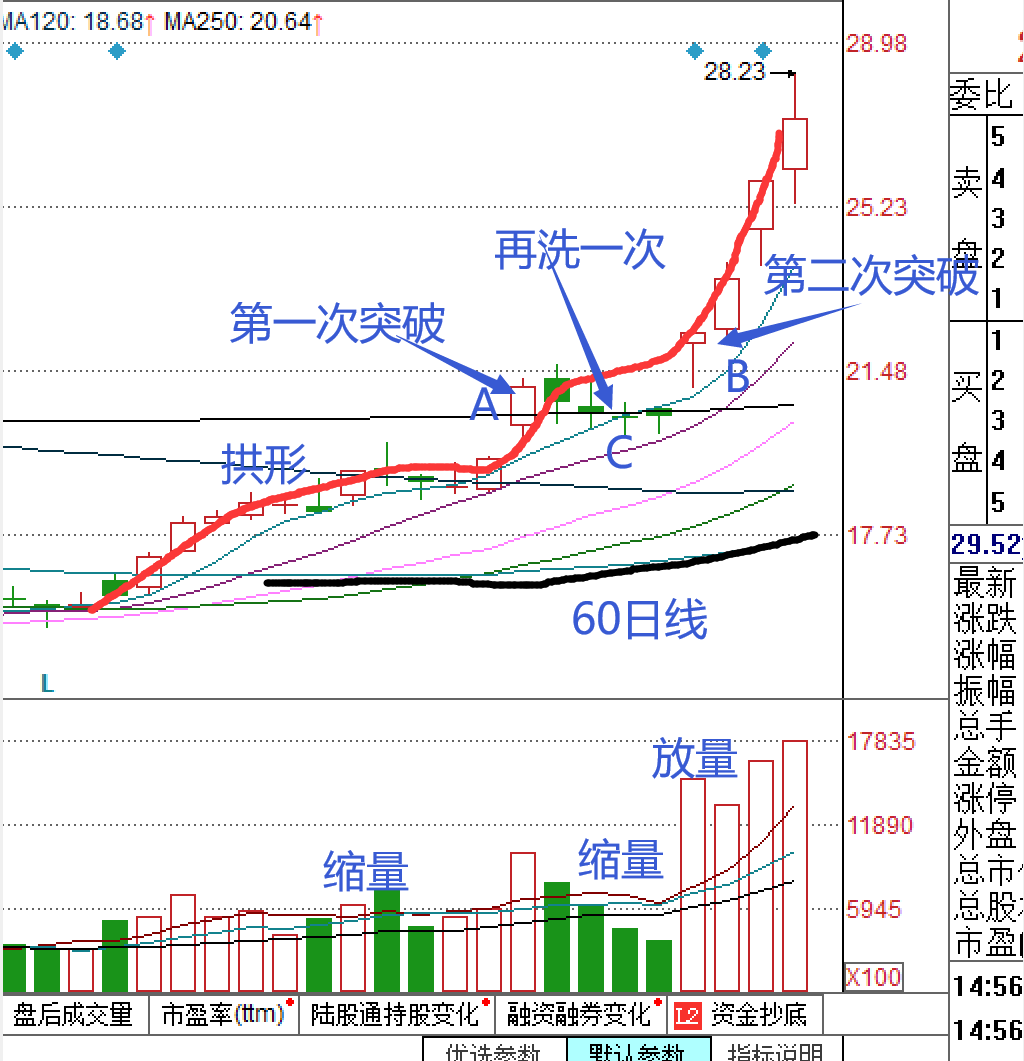 2、【拱形】:K线形态的前半段呈现出一个“拱形”特征,这意味着股价的重心正在上移。