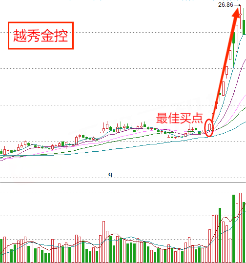 符合前两点就可以很明了地分析出来,有了建仓和洗盘行为,洗盘结束点就是缩量以后的再次放量。越秀金控在一波温和放量以后,随后成交量缩量,虽然在6月22号出现放量了,但是不是涨停板。这一天是最佳买点,但不是涨停板的话爆发力不够。因此最佳买点是在7月3号的放量涨停板这天。