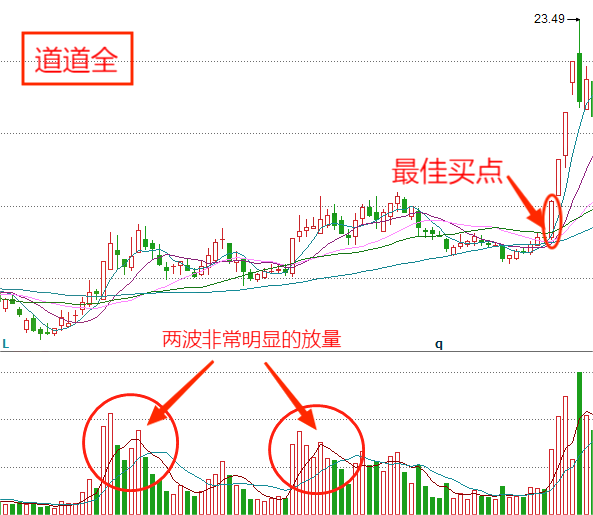 3、如果是前面出现了2波非常明显的放量,在第二波放量以后量能严重缩量以后,出现了一个放量的阳线,快涨停的时候就是买点。