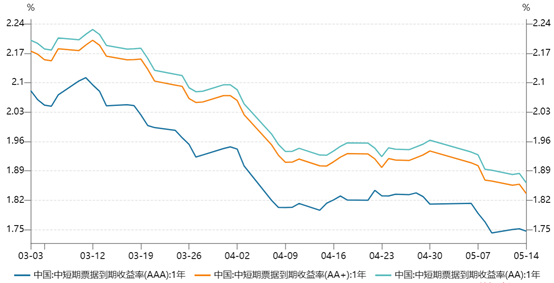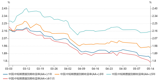 相对而言,长久期、高等级信用债收益率下行的阻力更大。5月以来,5年期AAA级中短票据的到期收益率只下降了2BP。