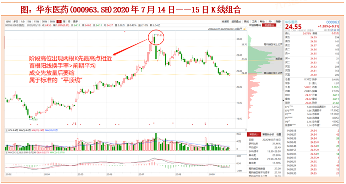 以上就是对“平顶线”的介绍,“平顶线”一般是由两根K线组成,但在一些特例中,会与其它K线组合,如射击之星、乌云盖顶等同时出现,这样可以互相验证,反转意图更为明显。