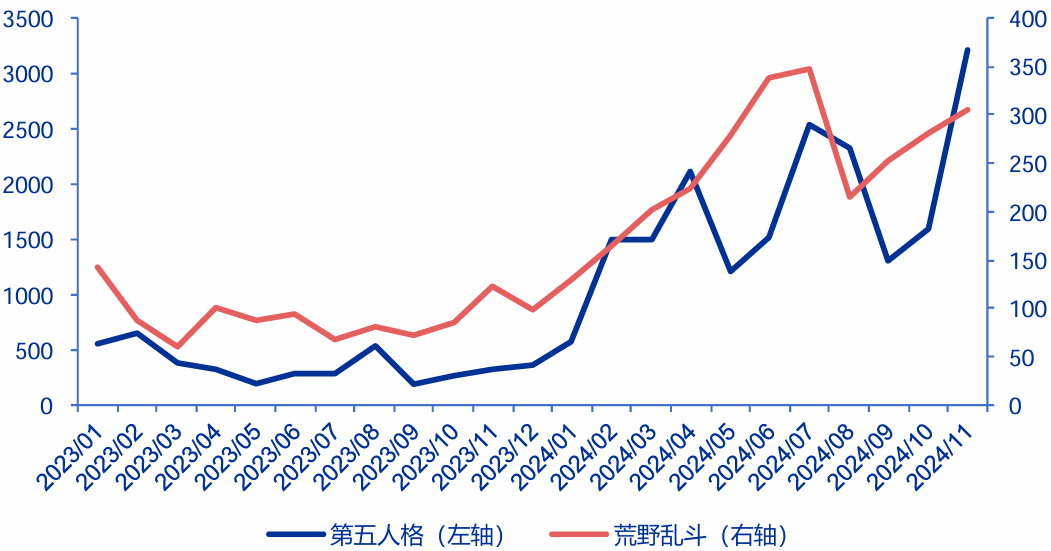 2024年MOBA垂类赛道“复活”,《第五人格》《荒野乱斗》走出向上趋势。《第五人格》(非对称MOBA)《荒野乱斗》(3V3 MOBA)均为MOBA垂类赛道的代表产品,