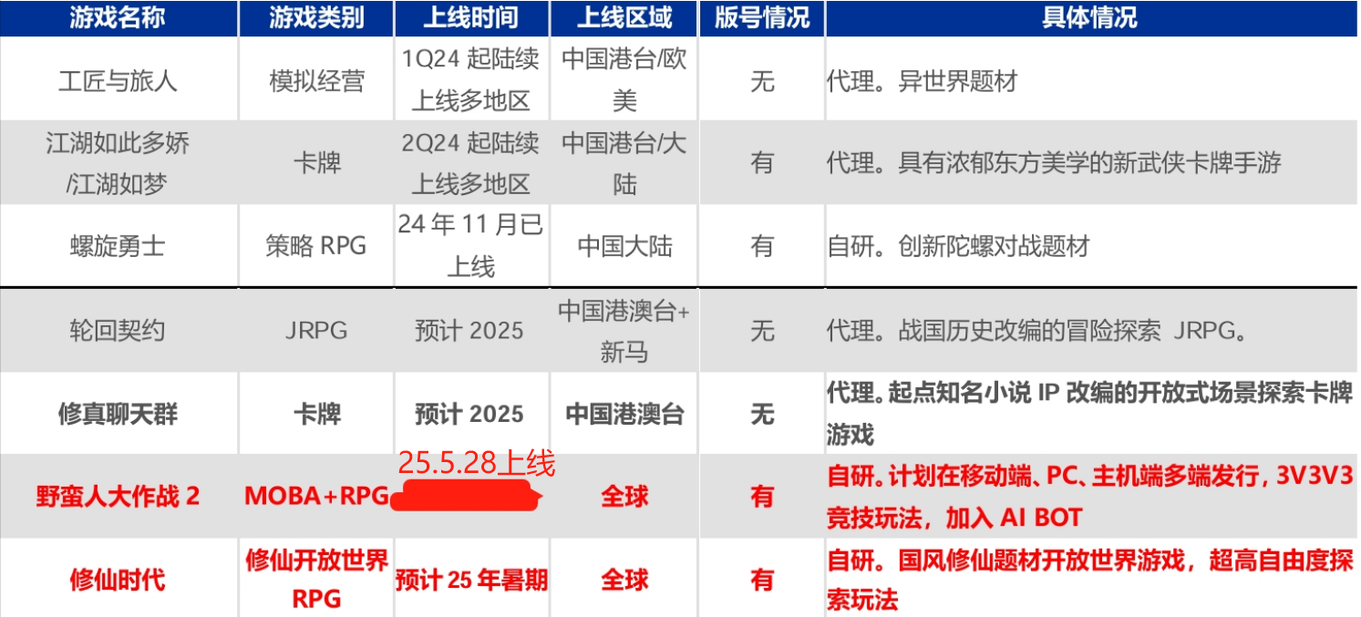 2)修仙开放世界RPG《修仙时代》:公司自主研发、腾讯独家代理的国风水墨开放世界修仙游戏,已获得移动、PC端版号,已亮相2025腾讯游戏发布会,由明星创始人余晓亮带队开发,具备修仙题材、开放场景、自由玩法等特点,预计25下半年上线。