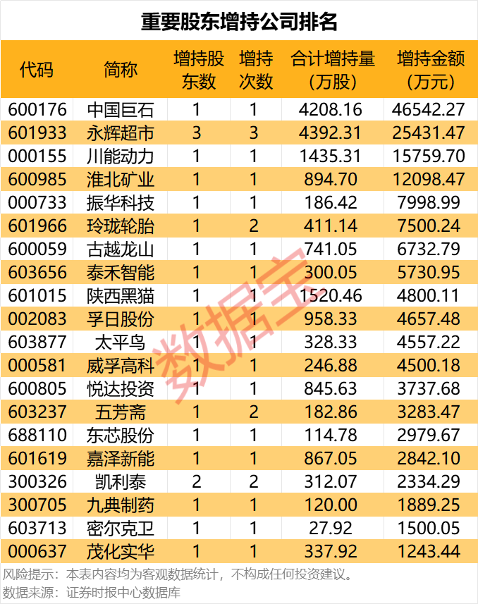 从增持金额看,近5日增持金额在1000万元以上的有20家,增持金额最多的是中国巨石,其间累计增持4208.16万股,增持金额合计4.65亿元;其次是永辉超市,增持量为4392.31万股,增持金额2.54亿元;川能动力近5日获股东增持1.58亿元,增持金额位居第三。