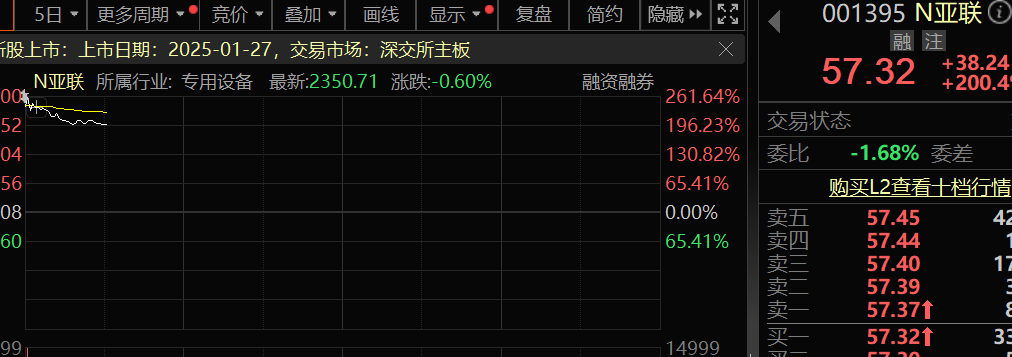 N亚联开盘价65.00元、上涨240.67%,公司主营业务为人造板生产线和配套设备的研发、生产、销售和服务,成功实现人造板生产线高端装备的国产替代,并在人造板生产装备市场先后推出全球首条薄型竹刨花板生产线、全球首条工业化生产的连续平压芦苇刨花板生产线、0.8毫米超薄纤维板生产线、可饰面木质重组材料连续平压生产线等行业领先产品。