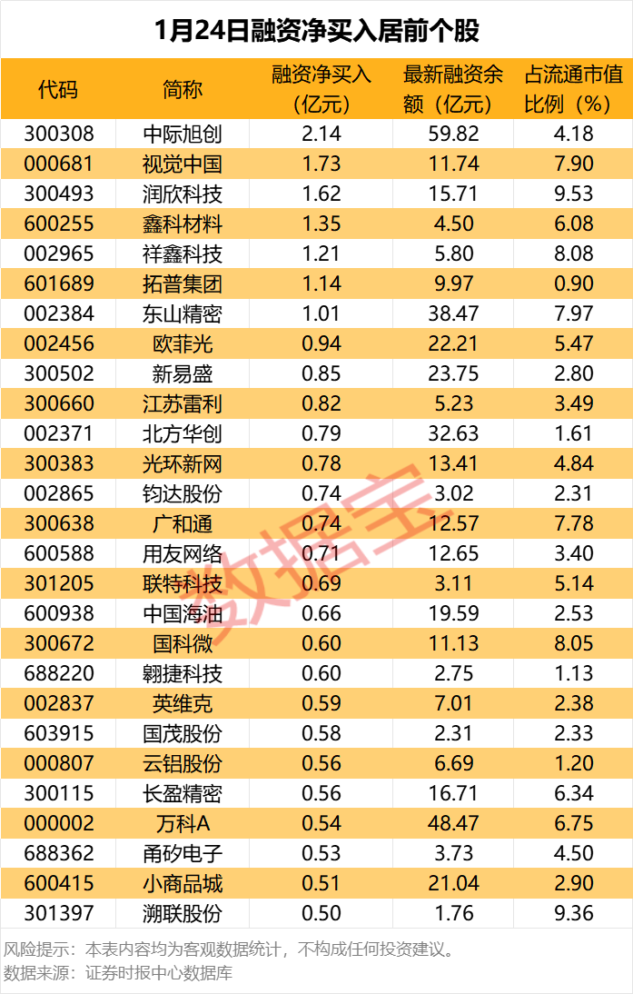 具体到个股,1月24日获融资净买入千万元以上的有218只,其中27只融资净买入额超5000万元。中际旭创融资净买入额居首,当日净买入2.14亿元,其次是视觉中国、润欣科技,融资净买入金额分别为1.73亿元、1.62亿元,融资净买入金额居前的还有鑫科材料、祥鑫科技、拓普集团等。