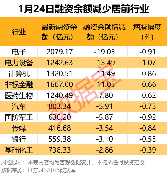 融资余额减少的行业有29个,电子、电力设备、计算机等行业融资余额减少较多,分别减少19.05亿元、13.49亿元、11.49亿元。
