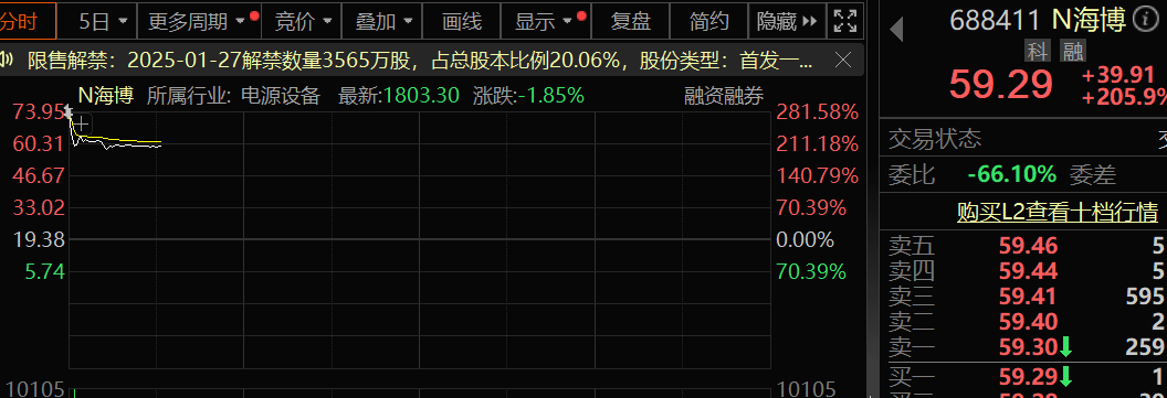 N海博开盘价73.60元、上涨279.77%。公司是国内领先的电化学储能系统解决方案与技术服务提供商,专注于电化学储能系统的研发、生产、销售,为传统发电、新能源发电、智能电网、终端电力用户等“源—网—荷”全链条行业客户提供全系列储能系统产品,提供储能系统一站式整体解决方案。报告期内,公司亦为新能源工程机械和新能源汽车领域的客户提供动力电池系统产品。