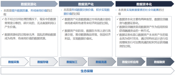 数据要素产业链包括数据采集、数据存储、数据处理加工、数据流通、数据分析、数据应用、生态保障七大模块,覆盖数据要素从产生到发生要素作用的全过程。