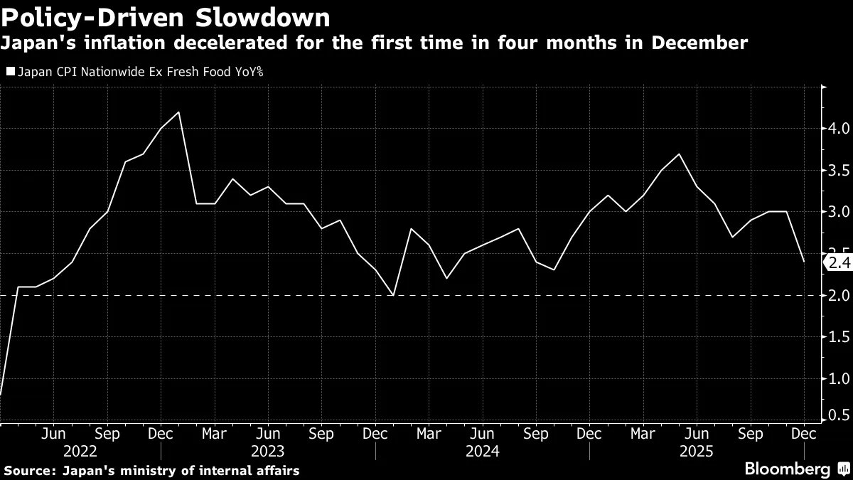 受政府补贴的影响,日本通胀率四个月来首次放缓。然而,在日本央行即将公布最新利率决议之际,该报告仍然强调了价格压力的潜在强度。周五公布的数据显示,日本12月份剔除生鲜食品后的消费者物价指数(CPI)同比上涨2.4%,涨幅较11月份的3%有所放缓,这一数据与经济学家的预期中值相符。12月整体CPI同比增速从上月的2.9%回落至2.1%,略低于预期的2.2%。