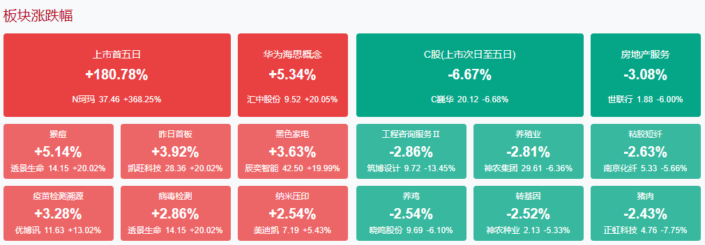 盘面上,华为海思概念股集体大涨,力源信息天邑股份惠伦晶体世纪鼎利等涨停。猴痘概念股午后走高,透景生命普利制药海辰药业兰卫医学等涨停。AI眼镜概念股维持强势持续爆发,联合光电博士眼镜、斯泰克、格林精密等涨停。铜缆高速连接概念股展开反弹,凯旺科技精达股份涨停。下跌方面,基建股集体调整,勘设股份跌停。此外多只高位人气股大跌,金龙汽车跌停。板块方面,华为海思、猴痘、AI眼镜、铜缆高速连接等板块涨幅居前,猪肉、影视、建筑装饰、贵金属等板块跌幅居前。