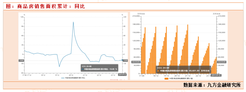 今年前九个月,房地产市场表现较为低迷,也造成了整个建材行业景气度持续下行。2024 年 1-9 月,TOP100 房企销售总额为 2.97 万亿元,同比下降 38.8%,降幅较前 8 月扩大 0.3pct,其中 9 月单月销售额同比下降 38.81%,环比下降 2.20%。1-9 月销售金额靠前的企业有保利发展(2421.0 亿元)、 中海地产(1988.0 亿元)、绿城中国(1871.9 亿元);销售面积靠前的企业有保利发展 (1343.0 万㎡)、万科(1321.9 万㎡)、绿城中国(926.0 万㎡)。2024年1-8月份国内商品房销售面积累计销售同比下滑18%,累计销售6.061亿平米。