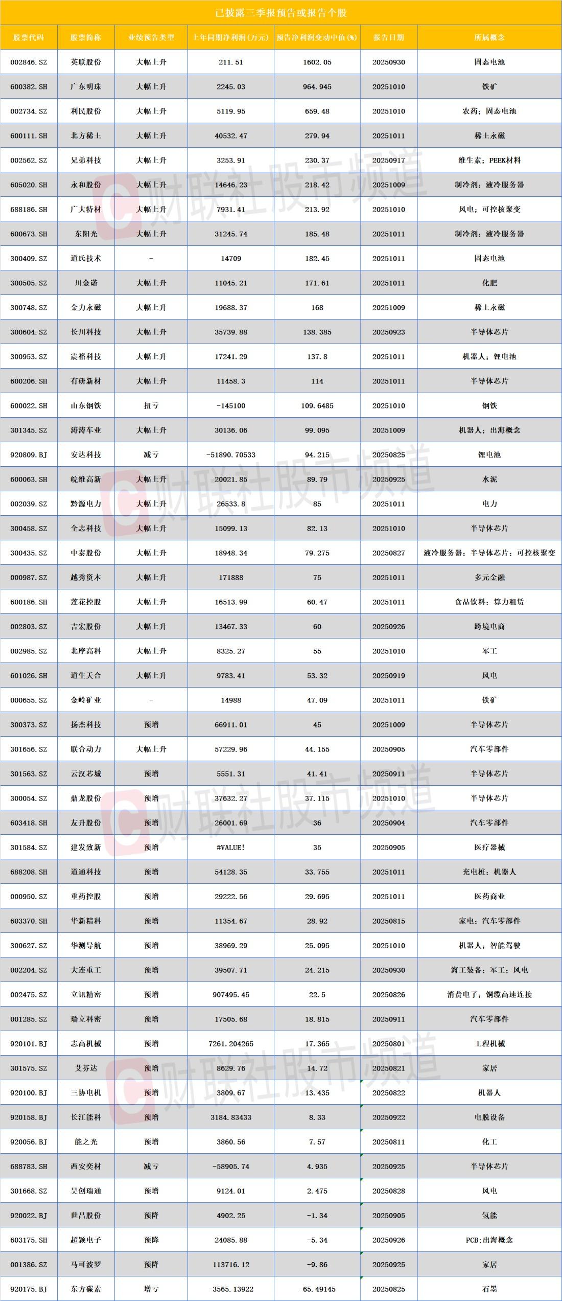 上表按净利润变动中值排序列出了已披露三季报预告或报告的个股情况,其中英联股份2025年前三季度净利润预计同比增长1531.13%–1672.97%暂居首位,此外广大特材、永和股份、兄弟科技、北方稀土、利民股份、广东明珠等个股前三季度净利预增超200%。