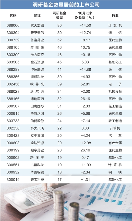 从参与调研的基金公司家数来看,10月以来,18家上市公司获得20只以上基金扎堆调研。天孚通信、航天宏图、普洛药业调研基金数目居前。