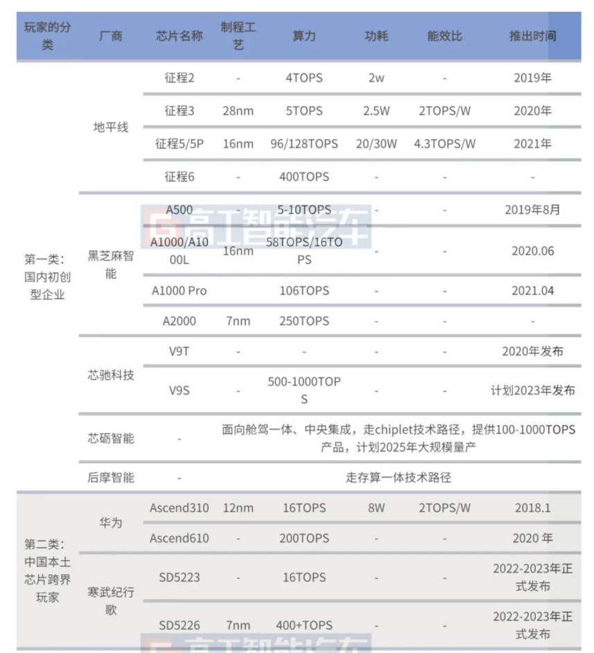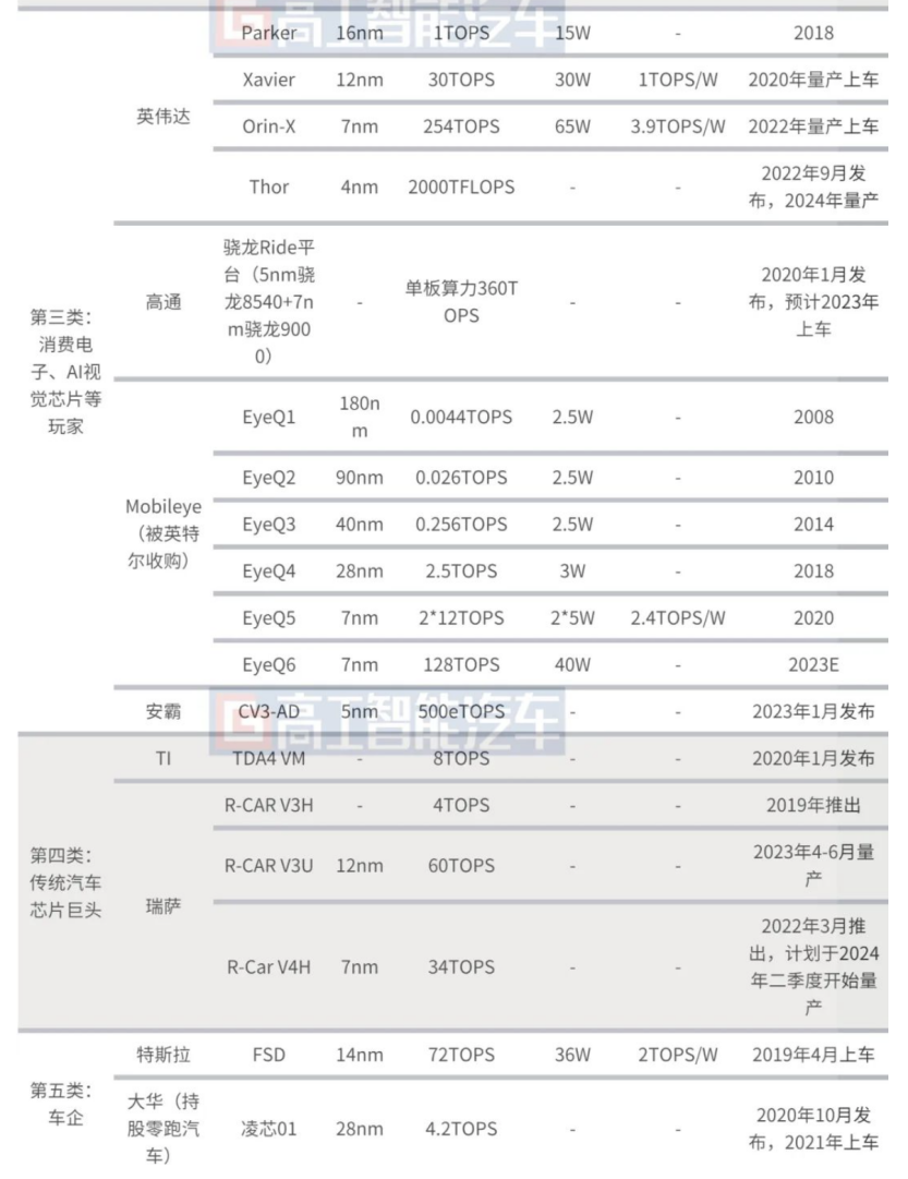 在智驾芯片市场竞争格局上,根据高工智能汽车梳理,玩家主要包括五类,分别是地平线、黑芝麻智能、芯砺智能、后摩智能等国内初创型玩家;华为、寒武纪行歌等国内本土芯片跨界玩家;英伟达、高通、英特尔(Mobileye)等消费电子芯片巨头;德州仪器、瑞萨等传统汽车芯片巨头,以及特斯拉、大华股份(持股零跑汽车)等车企自研玩家。