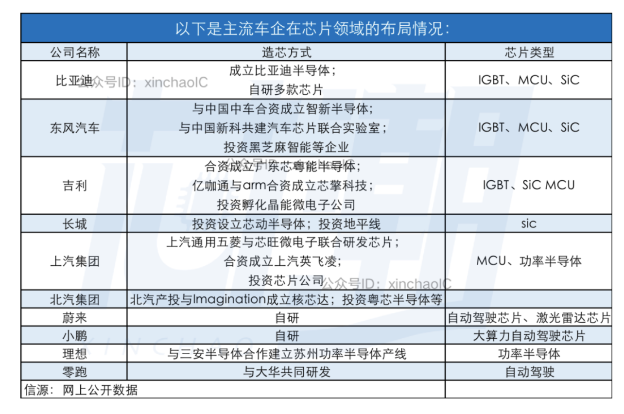 对于车企入局者,大部分主要受此前缺芯潮影响而开启造芯。根据公众号芯师爷文章整理,车企造芯主要通过与强者联合或是自力更生两种路径,其中,比亚迪、蔚来、小鹏汽车均尝试自研造芯。上汽集团、东风汽车、北汽集团则通过与地平线等企业合作造芯。