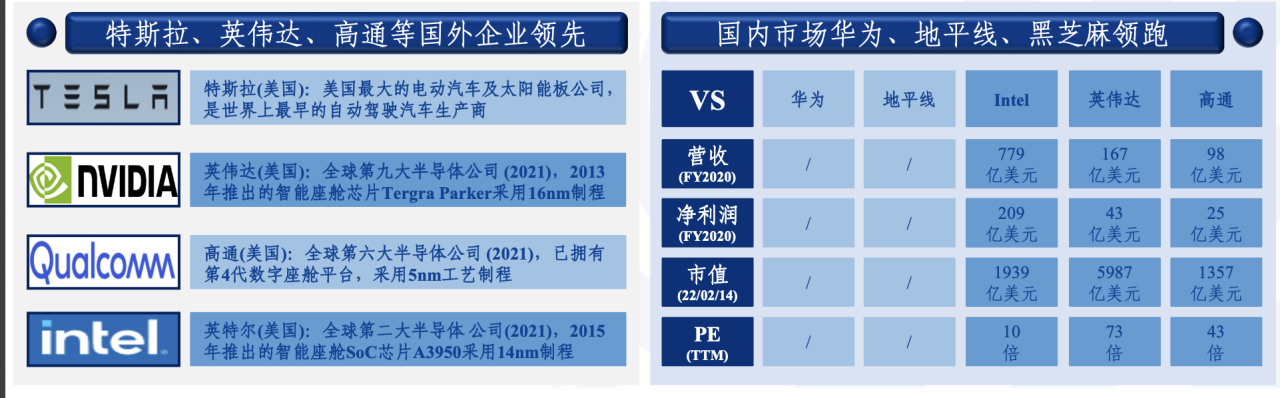 长城证券分析师唐泓翼在此前研报中指出,智能驾驶芯片通过对环境感知获得数据进行运算与分析,辅助驾驶员驾乘,规划泊车轨迹等。整体上特斯拉、英伟达、高通较为领先。根据财通证券7月7日研报显示,英伟达起家于GPU占据先发优势,自动驾驶平台芯片已更新到第五代,算力高达1000TOPS。高通则以座舱起家,通过差异化与英伟达竞争,而特斯拉的芯片则是自研自用,成功路径难以复制。