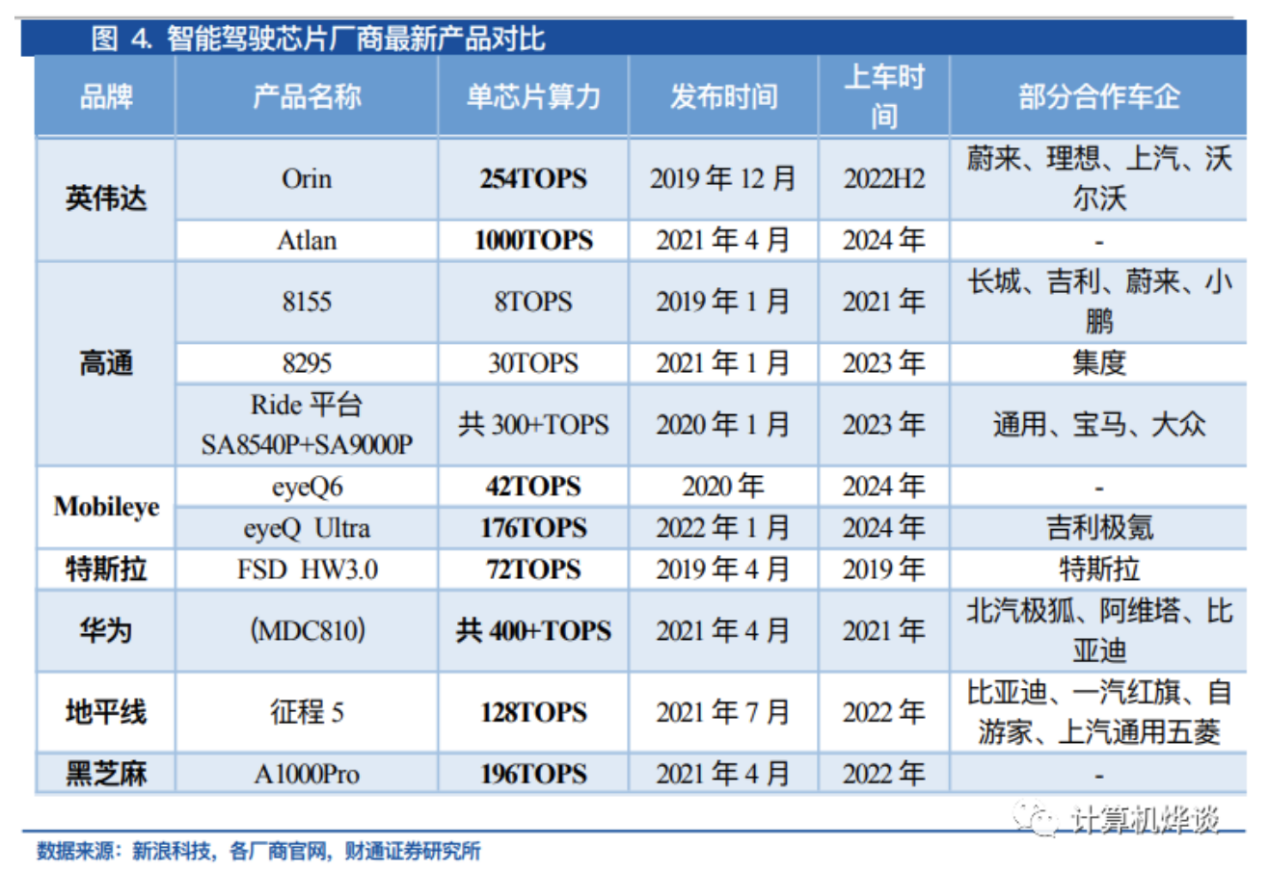 在国内初创或跨界的新玩家中,财通证券杨烨等人在研报中称,华为、地平线、黑芝麻的算力追平龙头。华为依托自身强大的Tier1能力已有多款车型披露量产在即,地平线定位Tier2,大算力芯片征程5已量产。于上月底递交港交所上市申请的黑芝麻致力于自动驾驶芯片研发,最新芯片算力达196TOPS。
