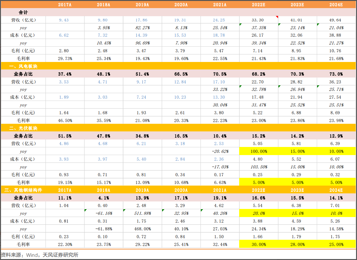 分行业看,公司目前主要的收入来自风电设备产品,2021年其收入占比已提升至70.52%。进一步拆分来看,公司风电设备产品收入每年均保持在较高的增速,我们认为主要受益于公司持续的产品及客户开发。