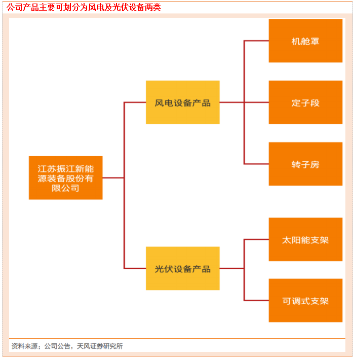 主要产品包括机舱罩、转子房、定子(段)、塔筒等风电设备产品,固定/可调式、追踪式光伏支架等光伏及光热设备产品;紧固件产品主要应用于需提供高品质防松性能行业如汽车、风电光伏等。