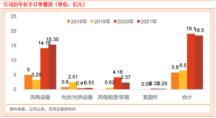 公司在手订单充足,截至2022年三季度末在手订单24.62亿元,为近5年来最高水平。其中风电设备产品订单20.29亿元,光伏/光热设备产品订单1.39亿元,海工船租赁服务2.09亿元,紧固件0.58亿元。