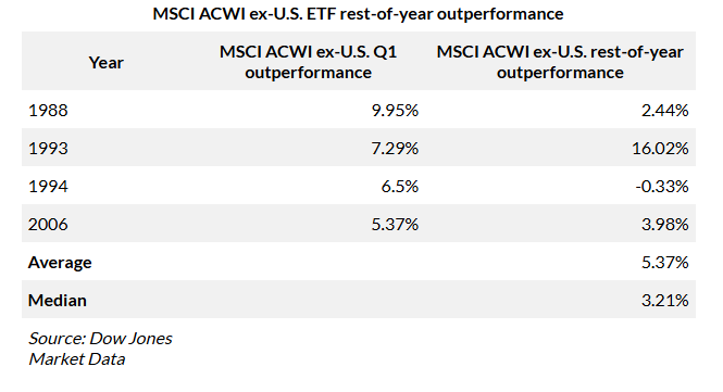 道琼斯市场数据对美国以外股票在第一季度跑赢标普500指数5个百分点以上的时期,进行了归总分析,相关数据可见下表: