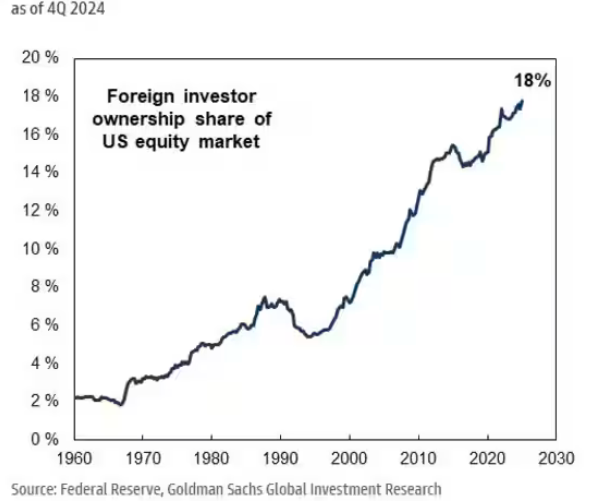 曾几何时,美股主要由美国投资者持有,但自21世纪初以来,外国买家大举涌入。根据高盛股票策略师引用的美联储数据,2024年末外资持有美股比例达18%,创历史新高——作为对比,2000年这一数字仅为7%,1960年仅为2%。