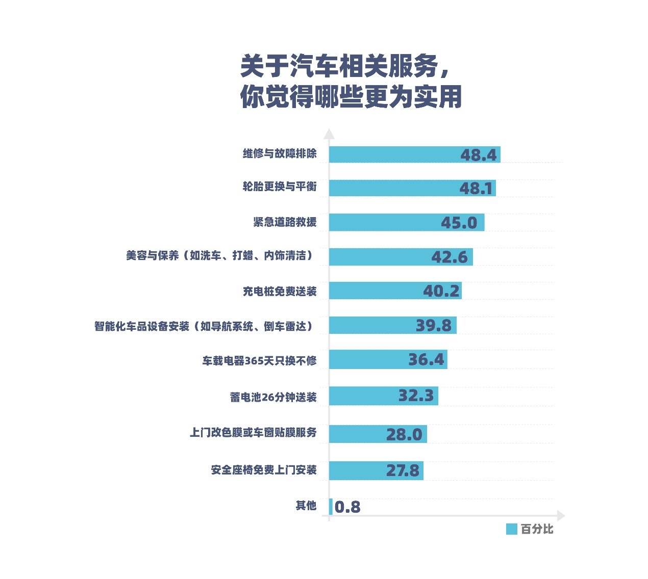 调研数据揭示了消费者对汽车服务质量的重视。在汽车相关服务的实用性调查中,48.4%的受访者选择了维修与故障排除,这表明消费者在汽车服务方面更倾向于选择能够提供高效、可靠维修服务的平台。