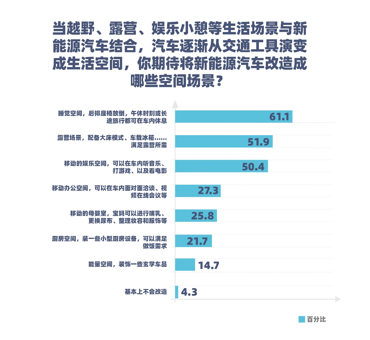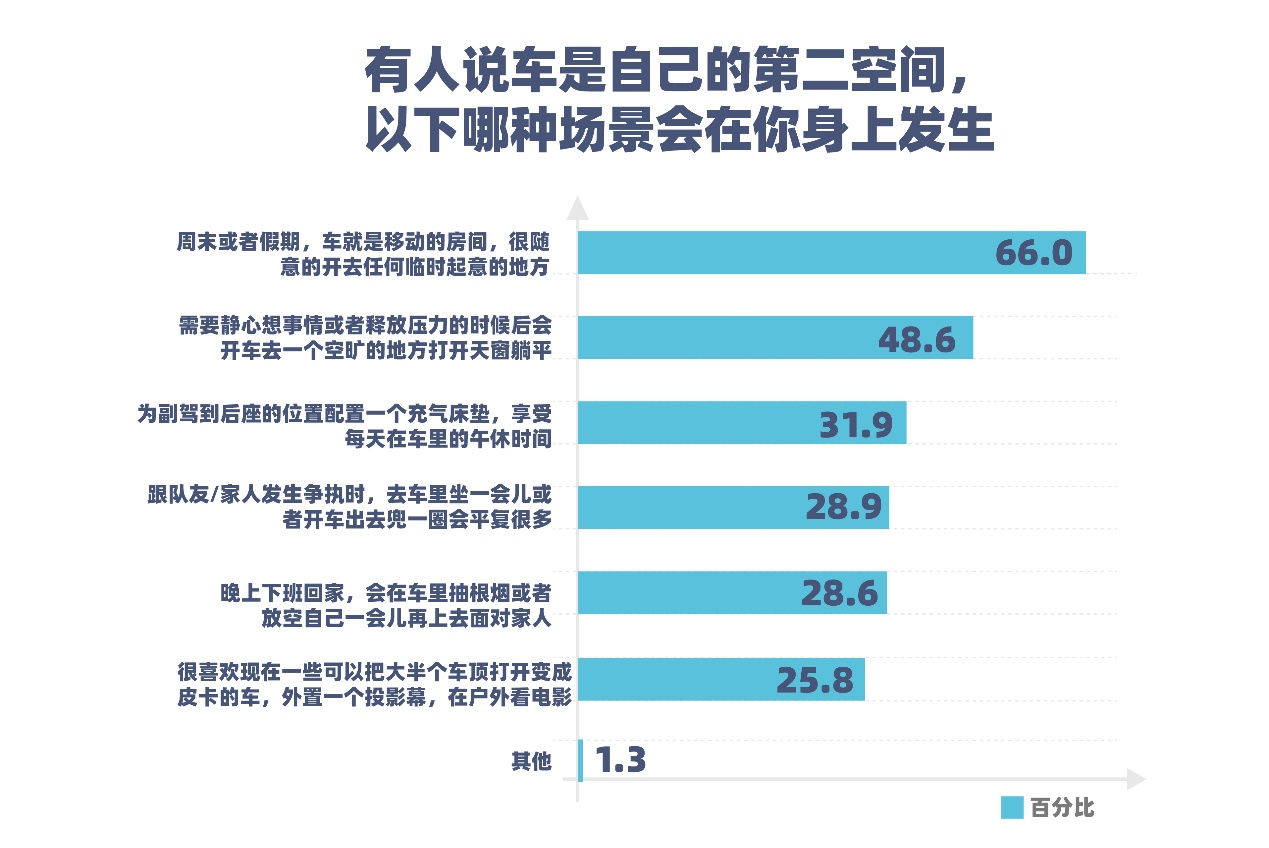 还有超过50%的消费者表示,希望将汽车打造成一个移动的电竞房、影音室等娱乐空间。车内可以提供高品质的音响设备、便携式游戏机,甚至是一个小型影院系统,让消费者在车内空间就可以享受音乐、游戏和电影带来的乐趣。