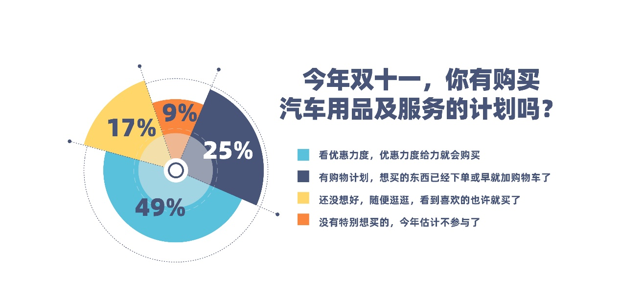 双十一也是汽车用品消费的重要节点。调研显示,49.1%的受访者表示会根据优惠力度考虑购买汽车用品及服务,而24.6%的受访者已经将心仪的商品加入购物车或已经下单。