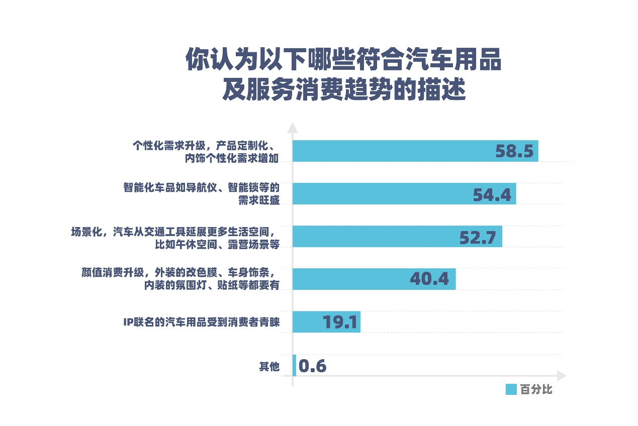 消费者越来越倾向于选择能够体现个人风格和需求的汽车用品。调研显示,58.5%的受访者表示“个性化需求升级,产品定制化、内饰个性化需求增加”;40.4%认为“颜值消费升级,外装的改色膜、车身饰条,内装的氛围灯、贴纸等都要有”。