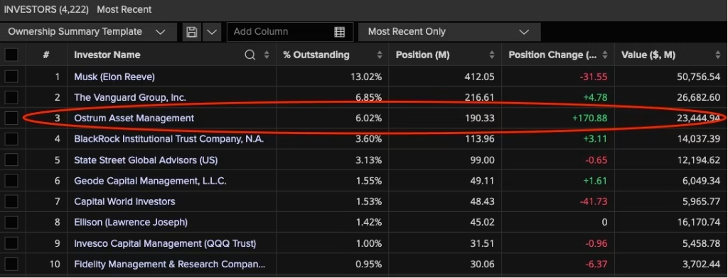 近日,在特斯拉的股东注册表上突然出现了一位神秘的新股东——Ostrum,是法国贸易银行投资管理公司(Natixis Investment Management)旗下一家鲜为人知的3770亿欧元子公司,主要代表欧洲保险公司投资债券。