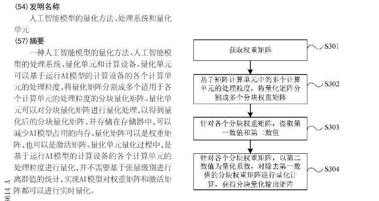 摘要显示,量化单元可以基于运行AI模型的计算设备的各个计算单元的处理粒度,将量化矩阵分割成多个适用于各个计算单元的处理粒度的分块量化矩阵。量化单元可以对分块量化矩阵进行量化处理,以得到量化后的分块量化矩阵,并存储在存储器中,可以减少AI模型占用的内存。量化矩阵可以是权重矩阵,也可以是激活矩阵。
