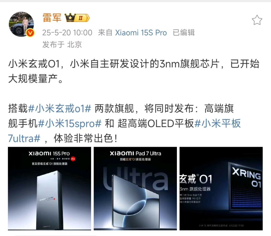5月20日上午,小米集团董事长兼CEO雷军在微博发文称:“小米玄戒O1,小米自主研发设计的3nm旗舰芯片,已开始大规模量产。”
