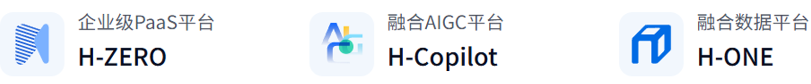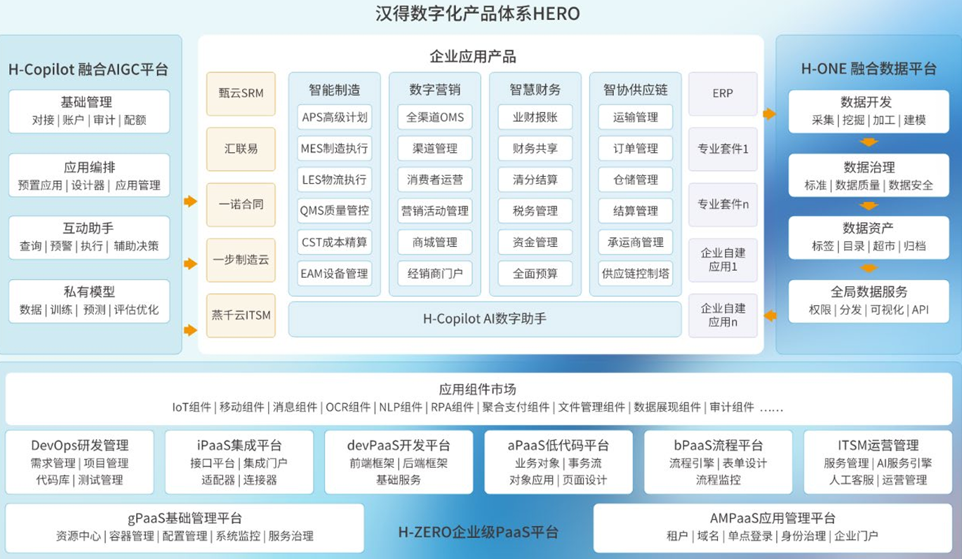 汉得数字化产品体系 HERO,核心包括汉得 H-ZERO 企业级 PaaS 平台、H Copilot 融合 AIGC 平台、H-ONE融合数据平台,以及四大专业应用系列,致力于助 力企业高效迈入“数字化转型2.0”。