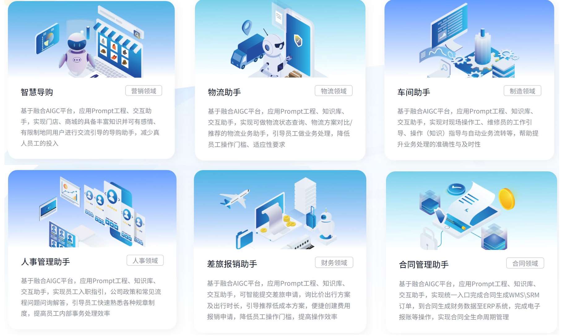 汉得信息AIGC应用场景包括:1)包括营销领域,门店、商城的具备丰富知识并可有感情、有限制地同用户进行交流引导的导购助手;2)车间助手,对现场操作工、维修员进行操作指导与自动业务流转等;3)合同管理助手,实现统一入口完成合同生成WMS\SRM订单,到合同生成财务数据至ERP系统,完成电子报账等操作,实现合同全生命周期管理;4)人事管理助手,实现员工入职指引,公司政策和常见流程问题问询解答。AIGC平台也能够为汉得自身及客户的IT人员提供前、后端开发插件,可指导员工代码编写、代码检查等,融合智能知识问答提供企业知识包含的开发、问题指导,提高软件开发和维护效率,解放更多创新能力。