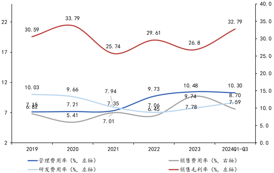收入实现类型来看,公司业务的收入类型主要包括以下五大类:服务费(包括咨询规划、实施、二次开发、运维等服务,按业务范围或按实际投入人天计价两种模式);OP软件产品License使用费;OP软件产品MA运维费;SaaS订阅费;软硬件及云基础设施分销。毛利率方面,2024前三季度得益于自主软件业务(产业数字化+财务数字化)毛利率显著提升。