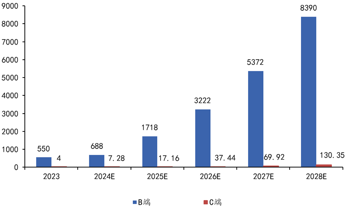 图:2023-2028E年中国B端和C端的AI Agent市场规模(亿元)