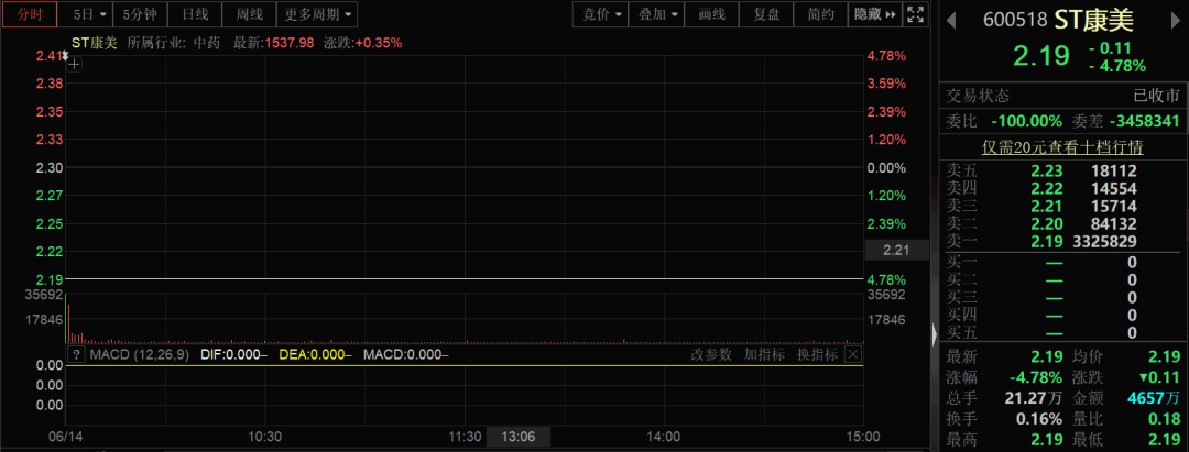 6月14日,市值300亿元左右的ST康美,开盘后一字跌停!