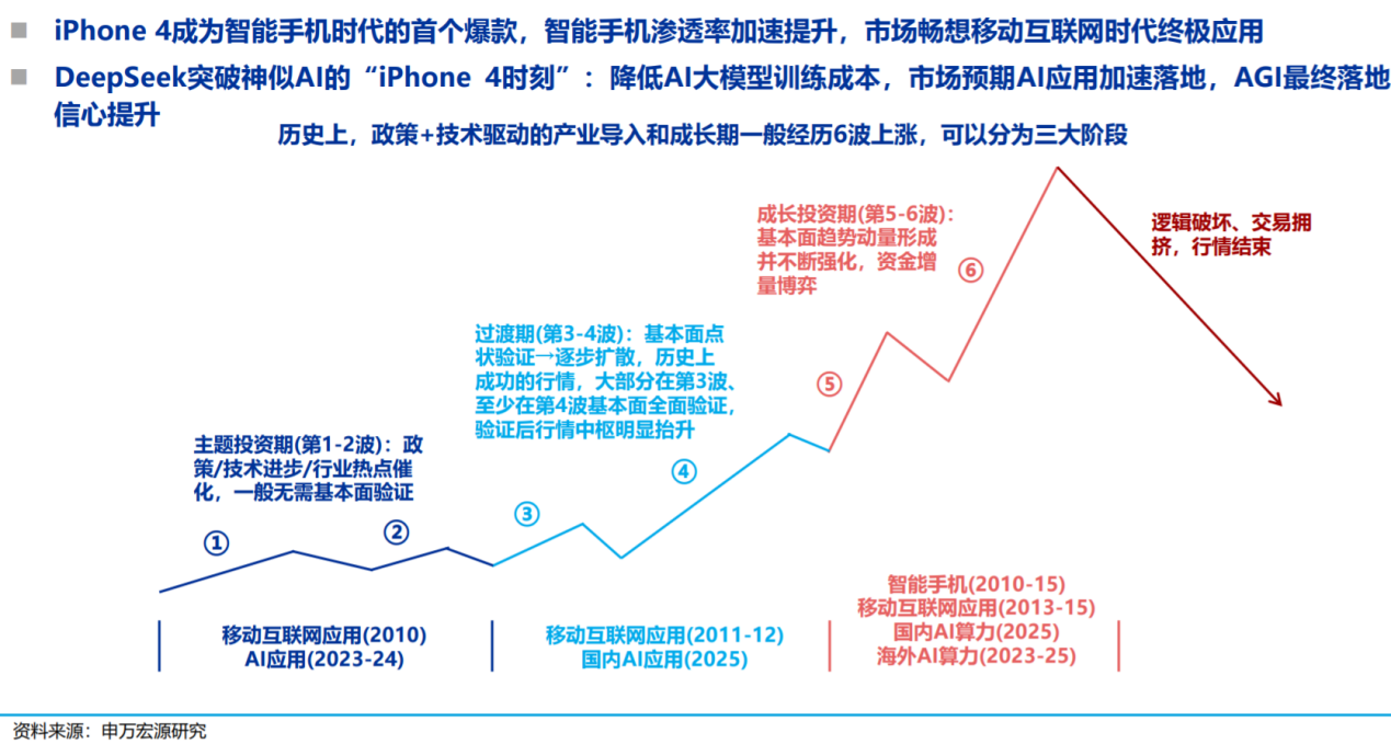 1.基础层重大突破后,硬件和应用主题行情全面扩散正当时。这波行情可能演绎到宏观和行业周期性高点+中期低性价比位置。短期低性价比往往不意味着行情结束,而是领涨细分行业可能切换的信号。