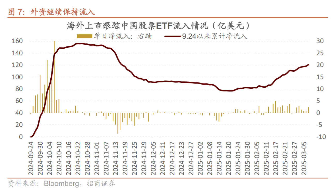 外资流入步伐仍未停止。春节后至3月7日,共有39亿美元资金流入海外上市跟踪A/H股的ETF,逆转了去年11月开始外资流出的趋势。9月24日至今共有超过120亿美元流入,累计净流入已回到去年10月7日水平。