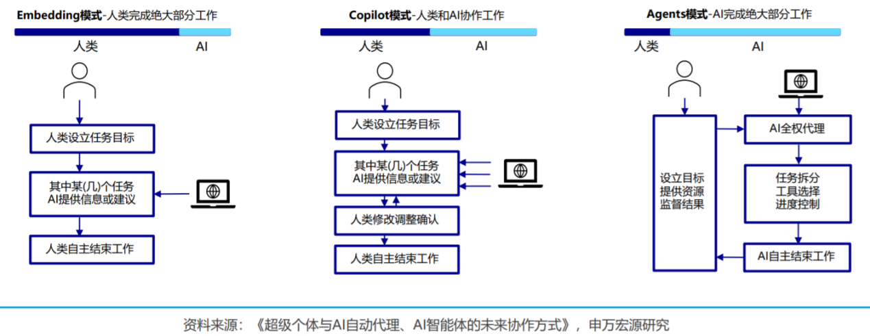 3)未来有望过渡到Agent模式,由人类设定目标并提供资源,AI完成绝大部分工作。