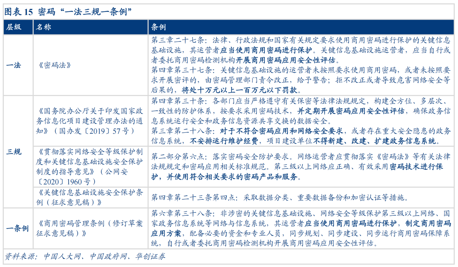 数据安全事件频发,定期密评及时发现问题并进行改造具备必要性。近年来,我国密码产业在法律法规、算法标准、产业应用、监管体系等方面进展显著。数字化+合规+信创是驱动密码行业保持快速增长的三大重要因素,行业有望迎来高景气度。
