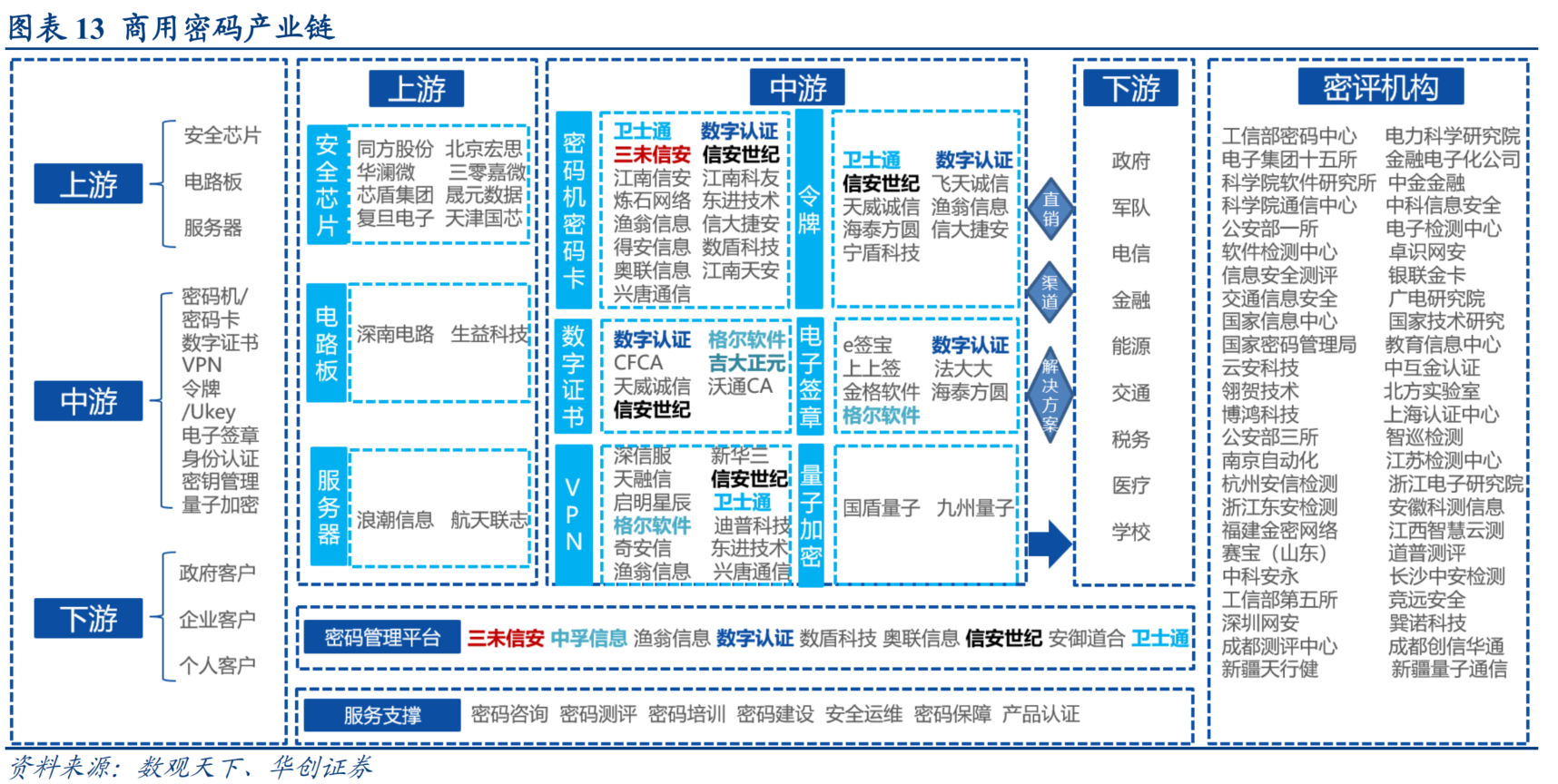 VPN领域参与的企业主要为深信服、天融信、信安世纪、启明星辰、卫士通、格尔软件、迪普科技、奇安信;令牌领域涉及的上市公司主要为卫士通、数字认证、信安世纪、飞天诚信、海泰方圆等;电子签章领域参与的企业主要为数字认证、海泰方圆、格尔软件等;量子加密领域涉及的上市公司主要为国盾量子、九州量子;下游密码管理平台领域参与的企业主要为三未信安、数字认证、信安世纪、卫士通等。