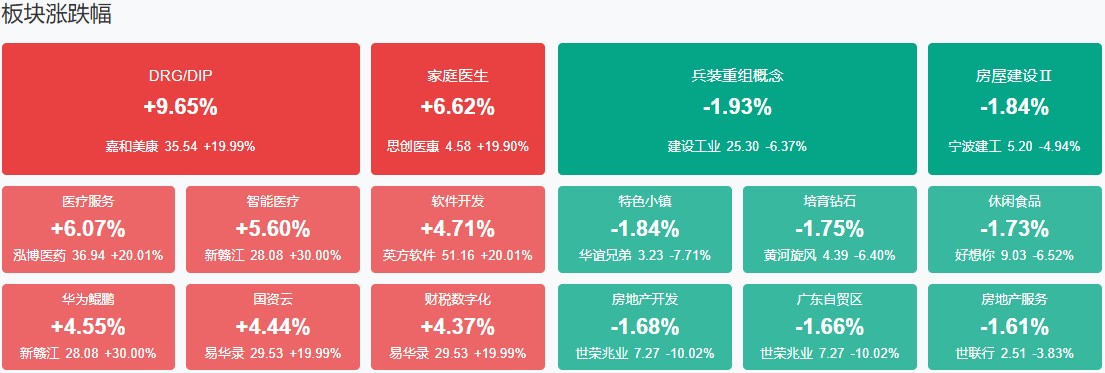 盘面上,市场热点继续围绕AI应用展开,个股跌多涨少。上涨方面,AI医疗板块今日全天强势,新赣江30cm涨停,20cm涨停井喷,嘉和美康、泓博医药、迪安诊断等20余股封板涨停;云计算板块亦表现强势,梦网科技8连板,拓维信息完成181亿的惊天反包,走出8天7板,数据港8天5板,南威软件2连板,神州数码等股涨停。下跌方面,影院院线板块今日有所回调,光线传媒逆市涨停连续5天20cm涨停,华谊兄弟、金逸影视、上海电影则有所下跌;机器人概念股持续调整,巨轮智能跌停;房地产板块今日表现低迷,世荣兆业尾盘触及跌停,光大嘉宝、财信发展、卧龙地产等多股下挫。