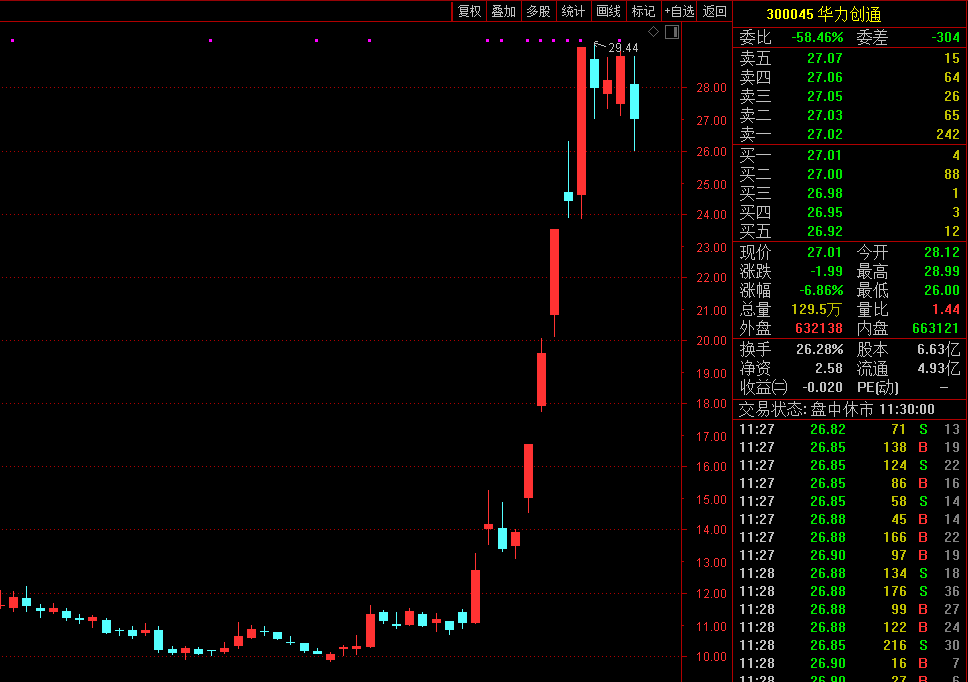 盘面上,6G概念、煤炭、电力、黄金等板块相对强势,光刻机、知识产权、水产品、百元股等板块跌幅居前。华为产业链短线跳水,华力创通一度闪崩跌超8%,此前,公司股价从11.40元/股涨至29.44元/股,其间股价涨幅超170%。
