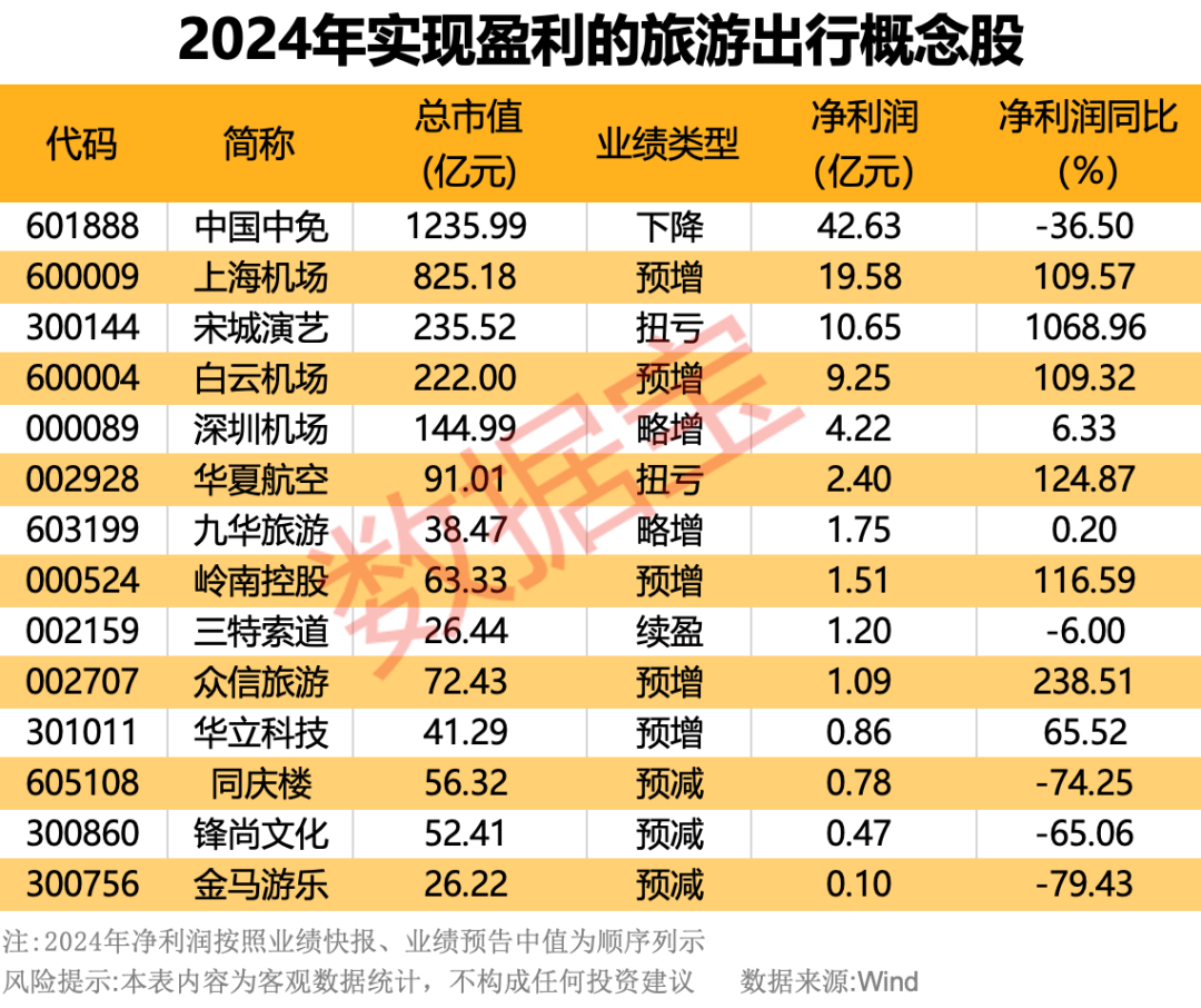 旅游市场的热度有望助力相关上市公司业绩复苏。据证券时报·数据宝统计,截至目前,50只万得旅游出行概念股已发布业绩预告,净利润为正的个股共计14只。其中上海机场、白云机场、众信旅游等预增,宋城演艺、华夏航空扭亏。