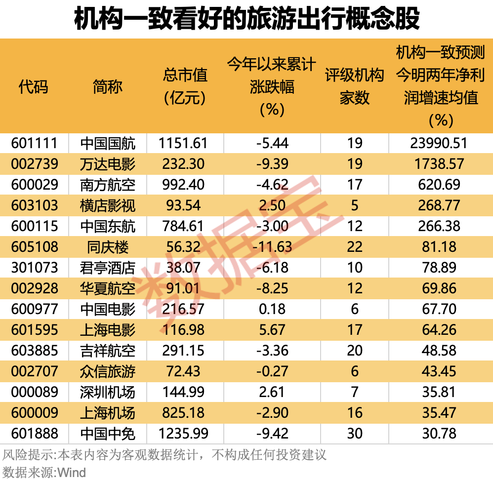 据数据宝统计,从机构关注度来看,15只旅游出行概念股获5家及以上机构看好,中国国航、万达电影、南方航空、横店影视、中国东航今明两年业绩增幅均值有望翻倍。