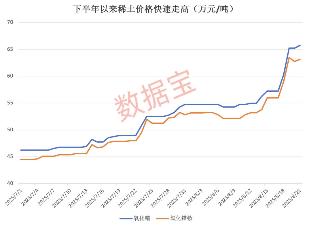 根据百川盈孚数据,截至8月21日,氧化镨报价65.75万元/吨,相比月初上涨11万元/吨,涨幅超20%,年内涨幅超58%。