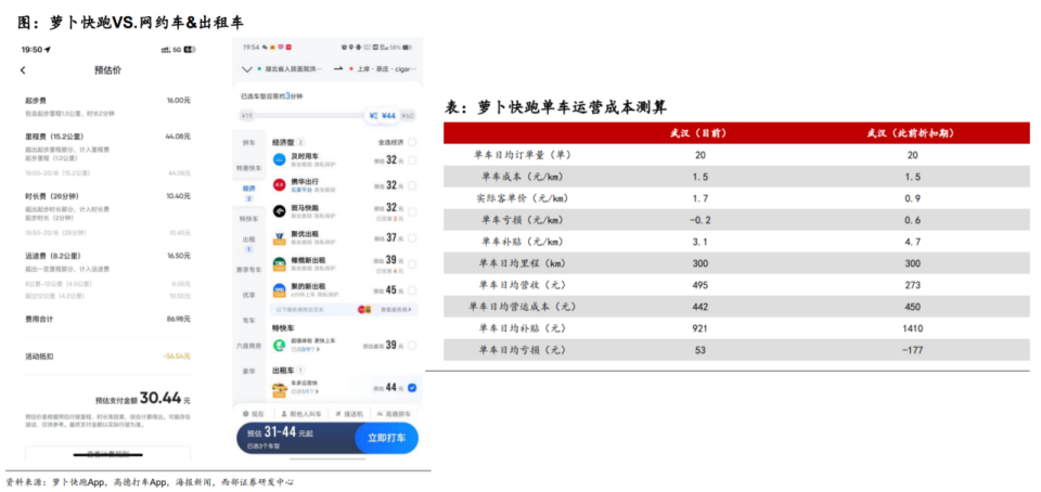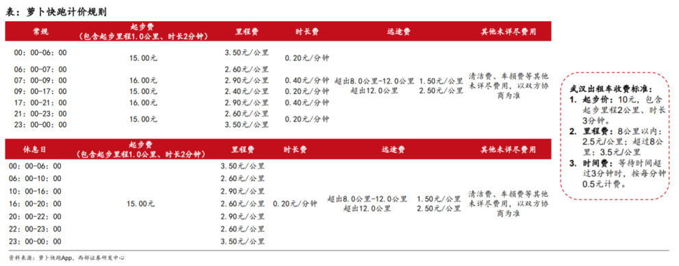 萝卜快跑收费标准高于武汉当地出租车。以10公里路程测算,萝卜快跑合计费用约为43元(以常规日9:00-17:00测算),对应武汉出租车在不考虑等待时间费情况下,合计费用约为30元,萝卜快跑约为出租车费用1.4倍。